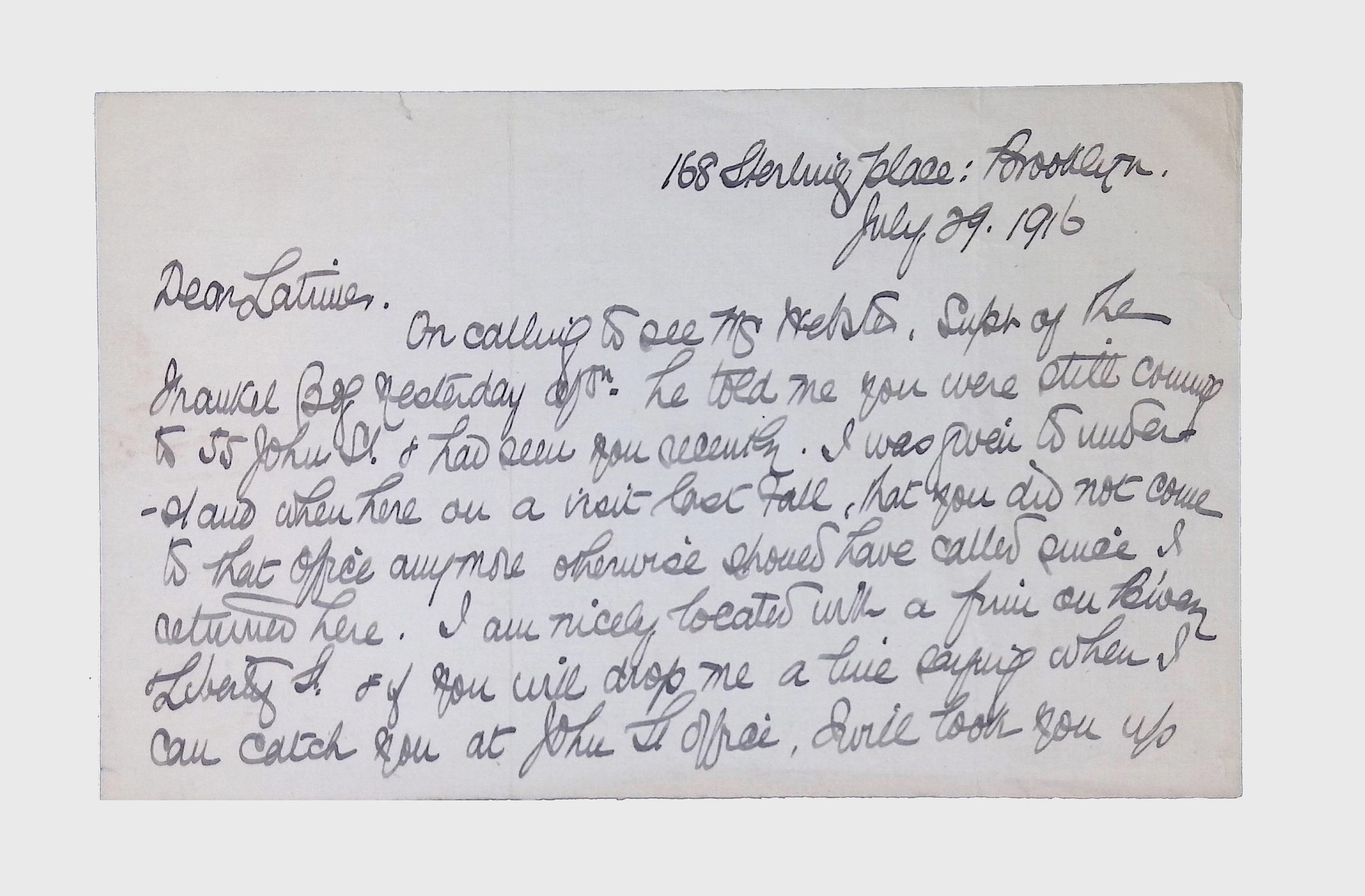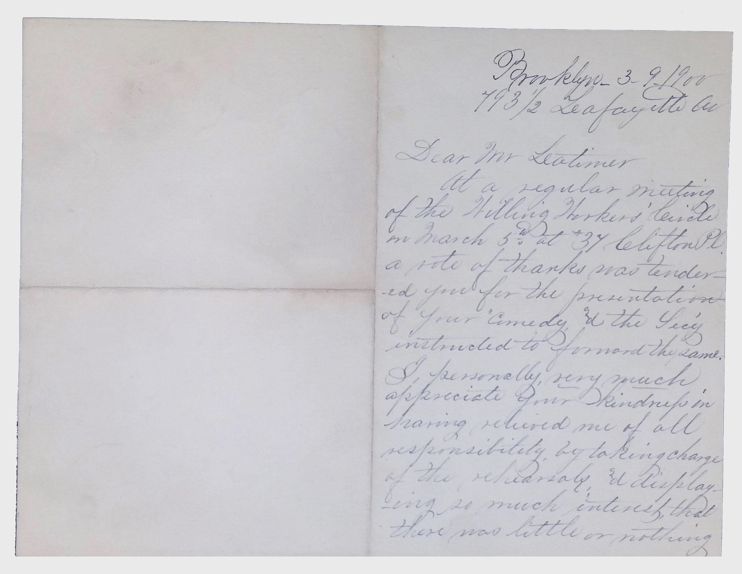 This folder contains a collection of letters, handwritten and typed documents, and envelopes related to the Latimer family. The materials date from the late 19th to early 20th century and include both personal and formal correspondence. Some documents appear to be official communications, while others include handwritten notes, petitions, and envelopes with postmarks.