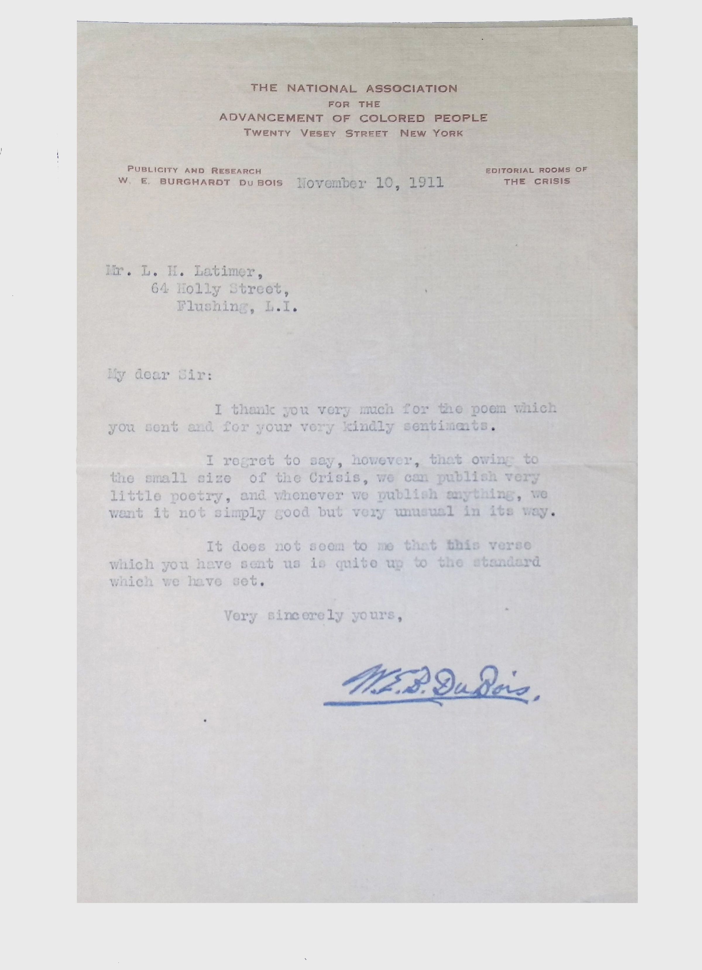 Rejection Letter from W.E.B. Du Bois to Lewis H. Latimer