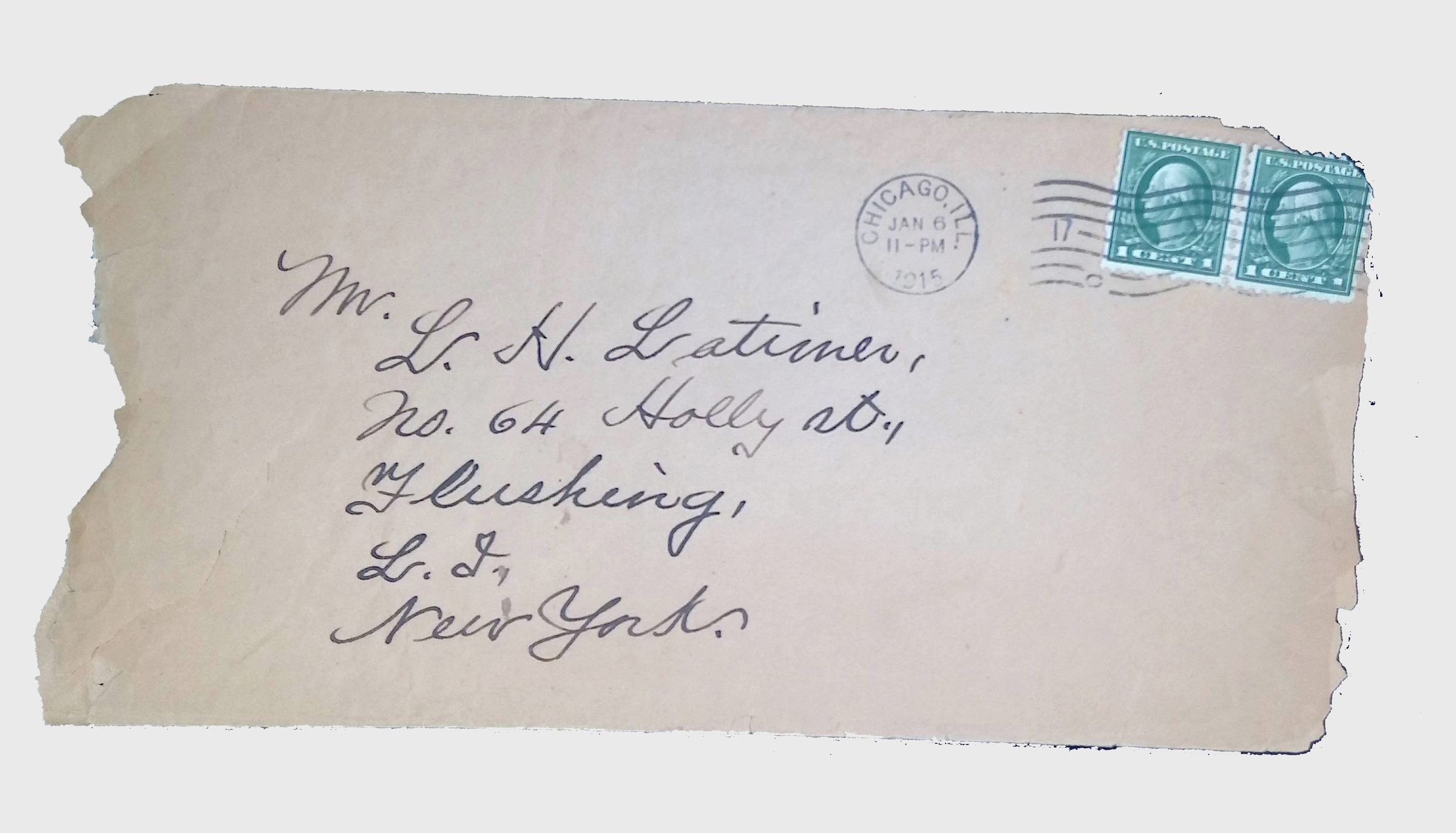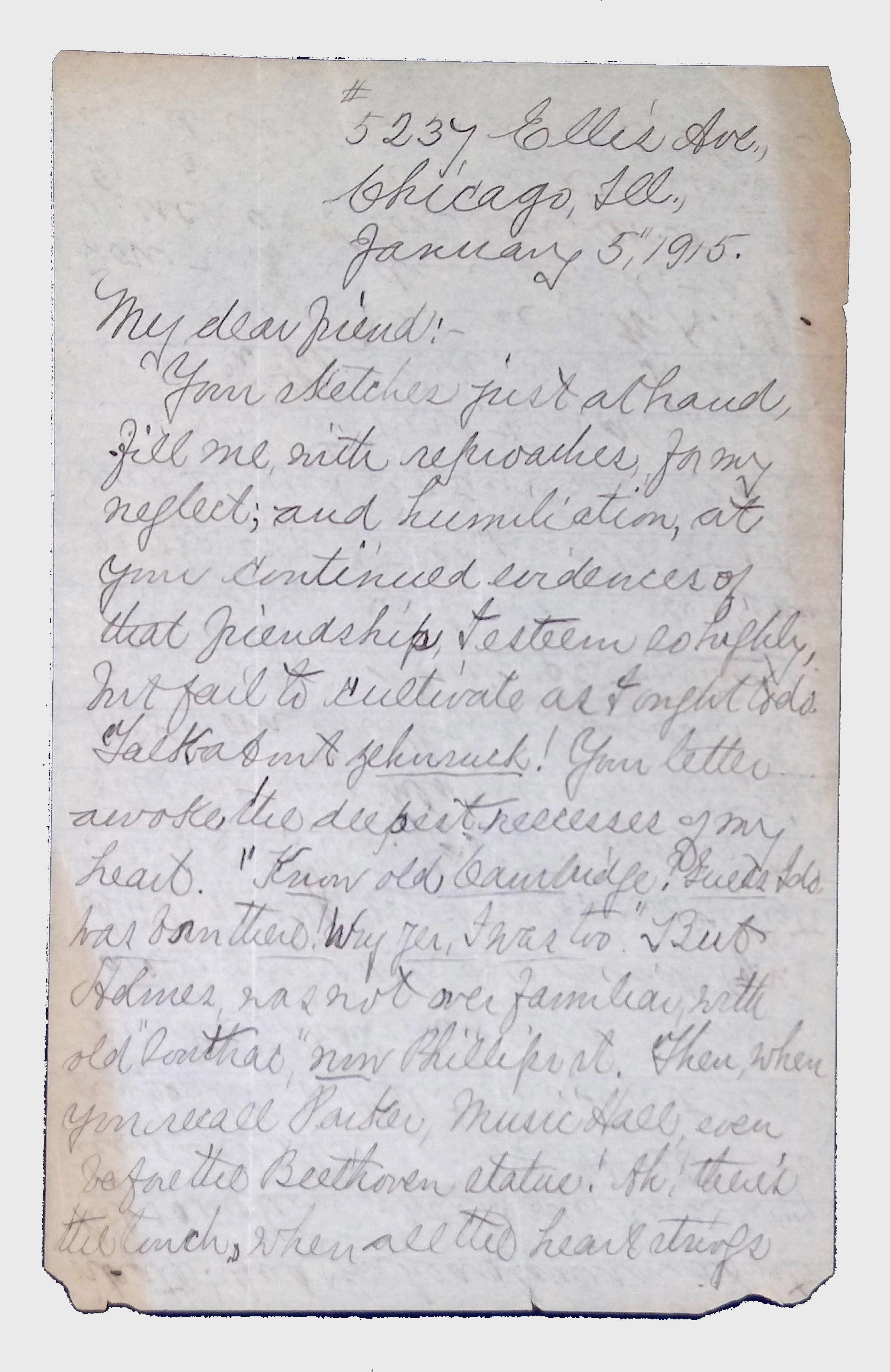 A handwritten letter dated January 5, 1915, to Lewis H. Latimer from his friend, the African American educator, scholar, and diplomat Richard T. Greener. The writer discusses nostalgia, shared experiences, and reflections on intellectual and cultural matters.