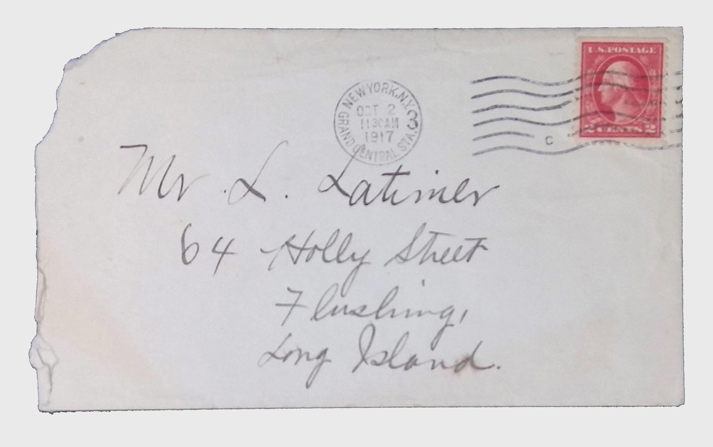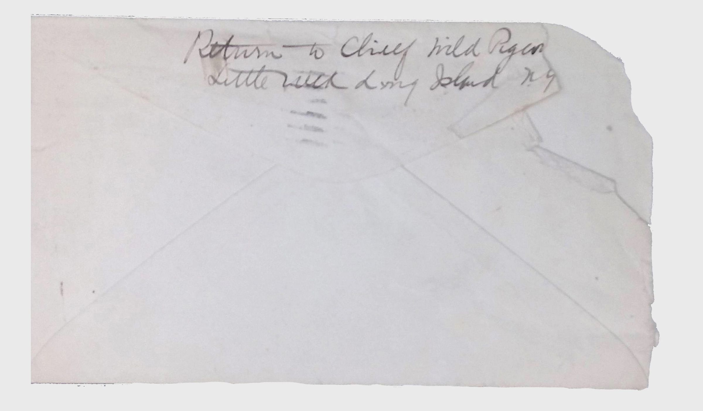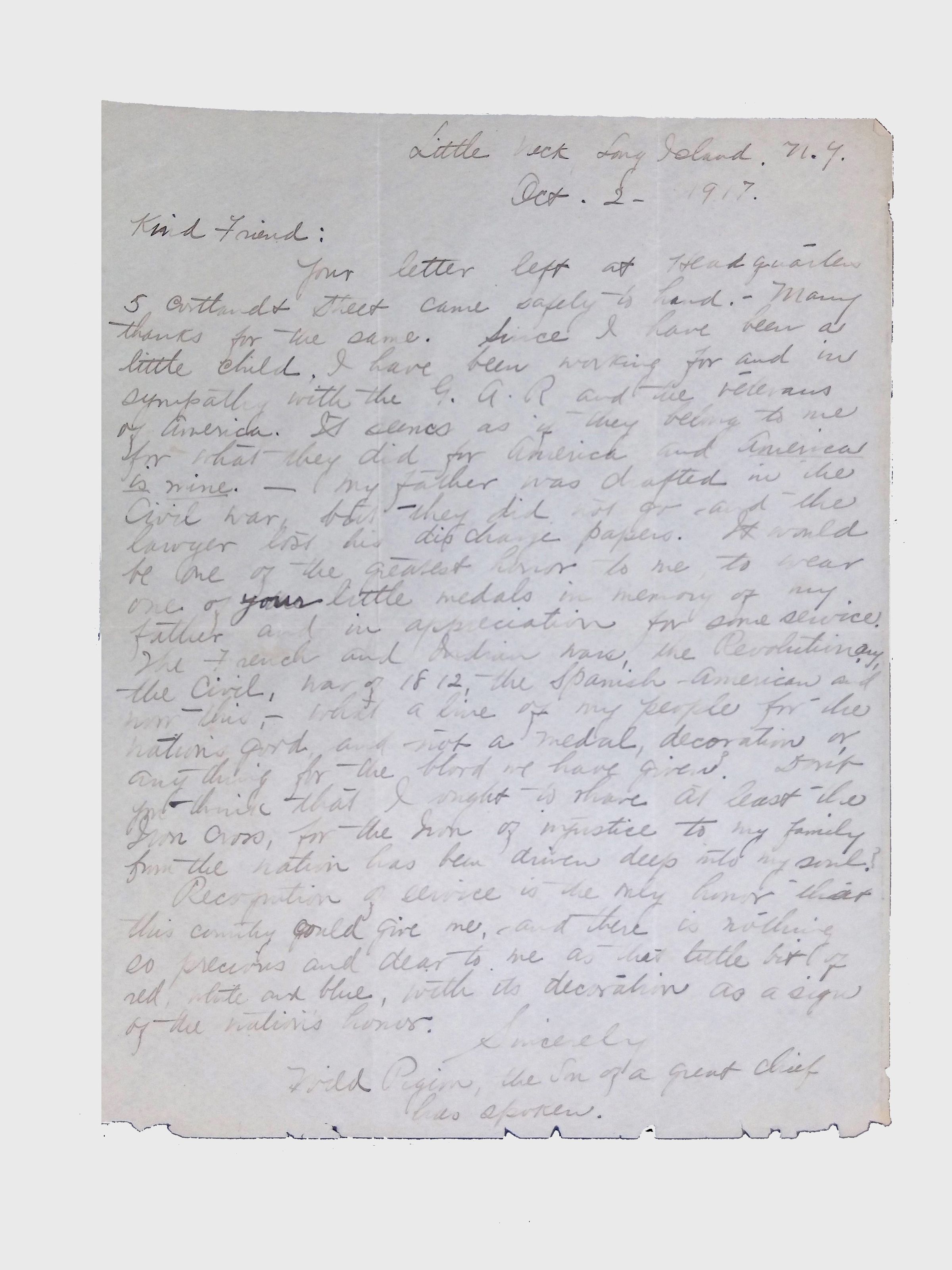 A handwritten letter dated October 2, 1917, from "Wild Pigeon," a Native American leader. Sent from Little Neck, Long Island, N.Y.