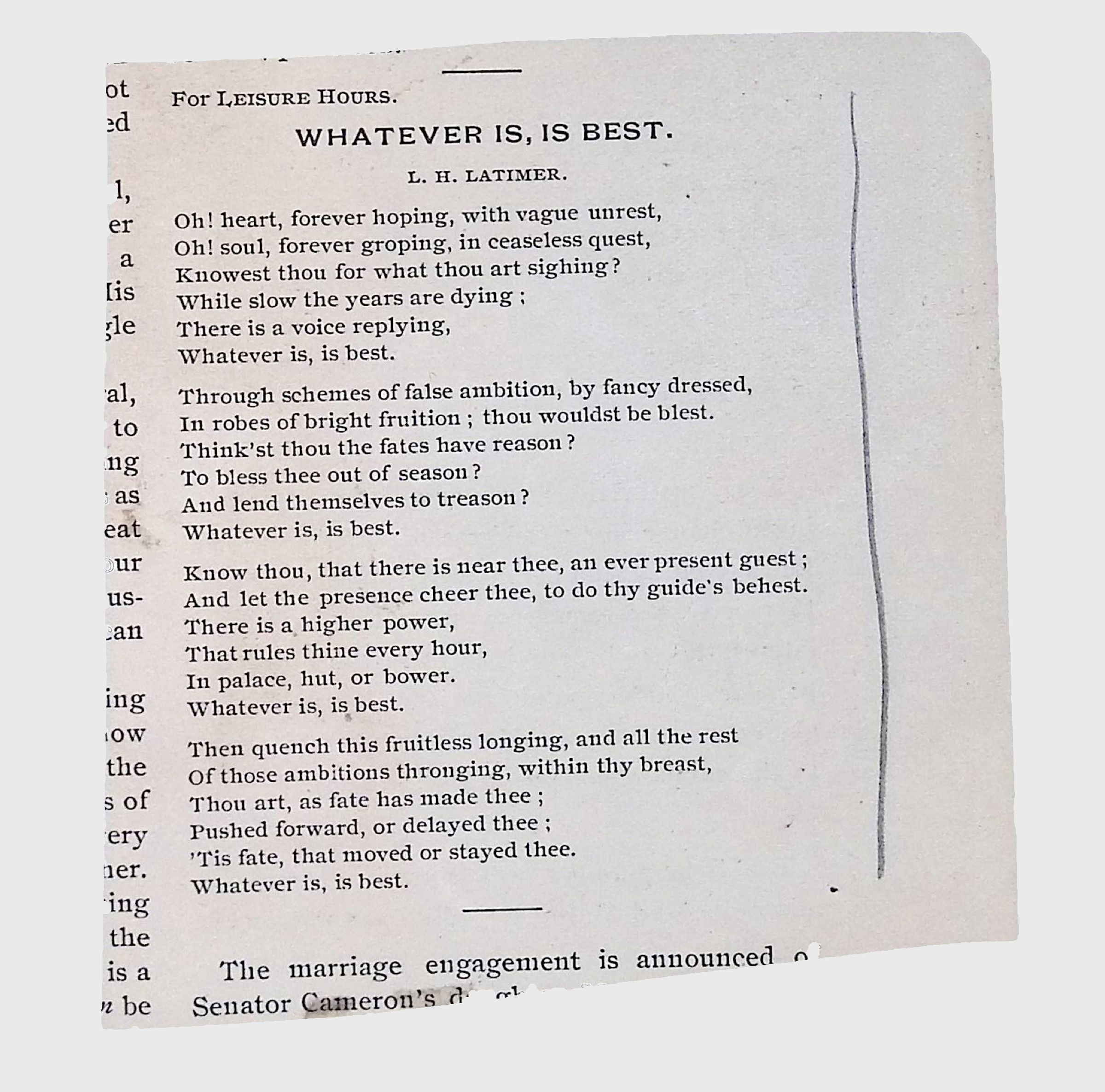 This folder contains a poem titled Whatever Is, Is Best by Lewis H. Latimer, showcasing his literary talent. The front and back of a vintage birthday card are also part of this collection, offering a glimpse into the sentimental exchanges within the Latimer family. The “Winsome Winnie” note is probably a birthday greeting from Lewis H. Latimer to his granddaughter Winifred Norman, who as an adult did so much to preserve Latimer’s legacy. "