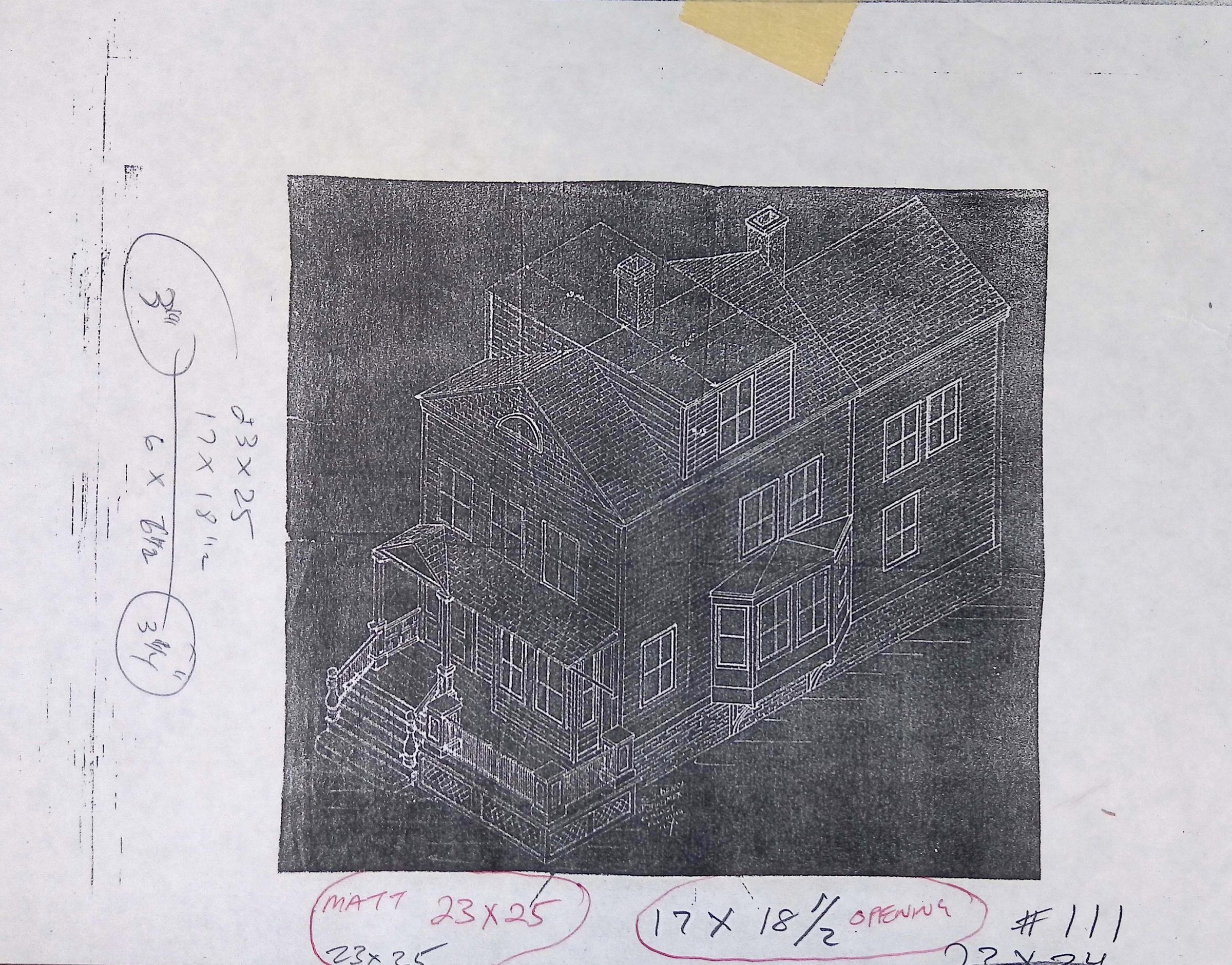 A series of historical photographs and blueprint-style sketches depicting the residence of Lewis Howard Latimer. The images include exterior views of the house, some mounted on aged backings. Additionally, blueprint-style sketches feature dimensions and structural details, annotated with handwritten notes indicating measurements and potential preservation work. These documents contribute to the historical record of Latimer’s home and its significance in African American heritage.