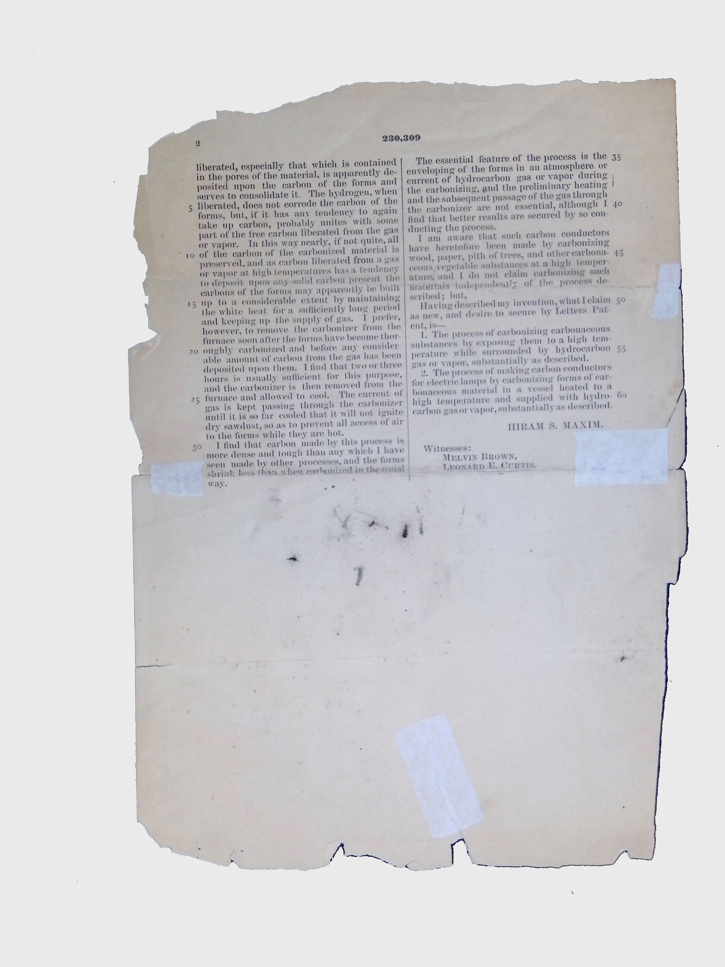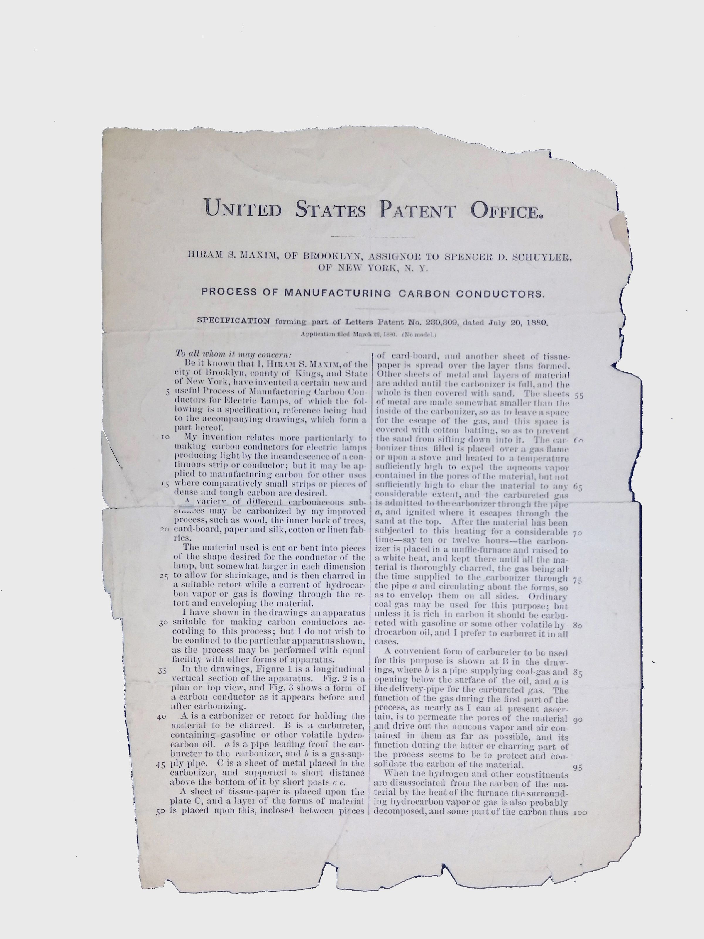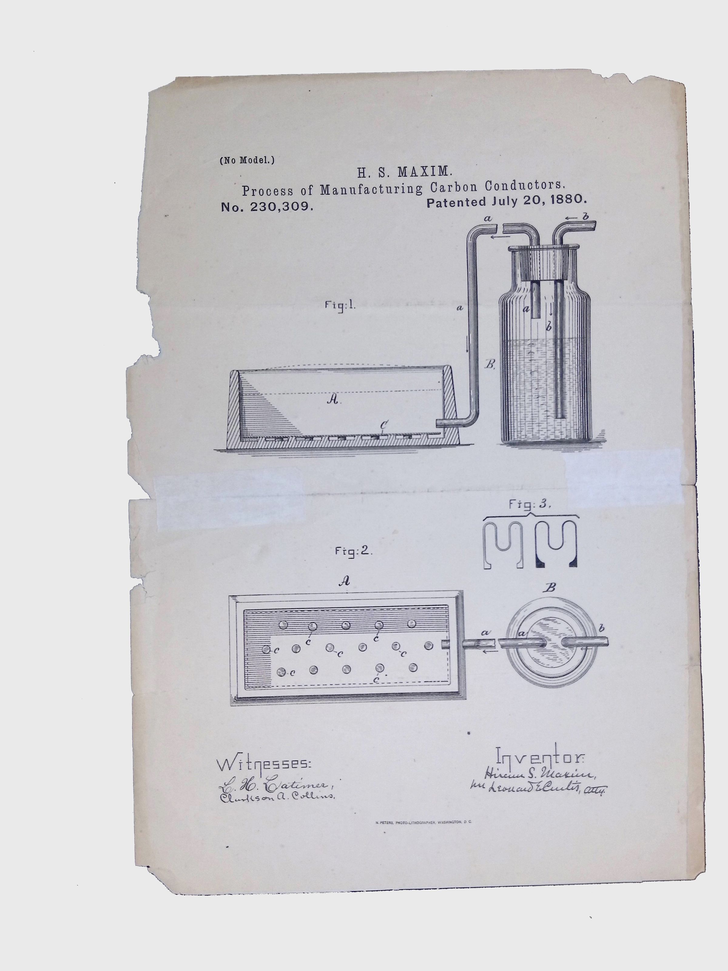 Lewis Latimer officially witnessed (and probably drew) this carbon manufacturing process patented by his boss, Hiram Maxim. Latimer worked closely with Maxim in Bridgeport, Connecticut, and New York City between 1879 and 1881, “acquainting myself with every branch of electric incandescent light construction and operation,” as he later wrote. Latimer most likely contributed to patents that bore Maxim’s name.