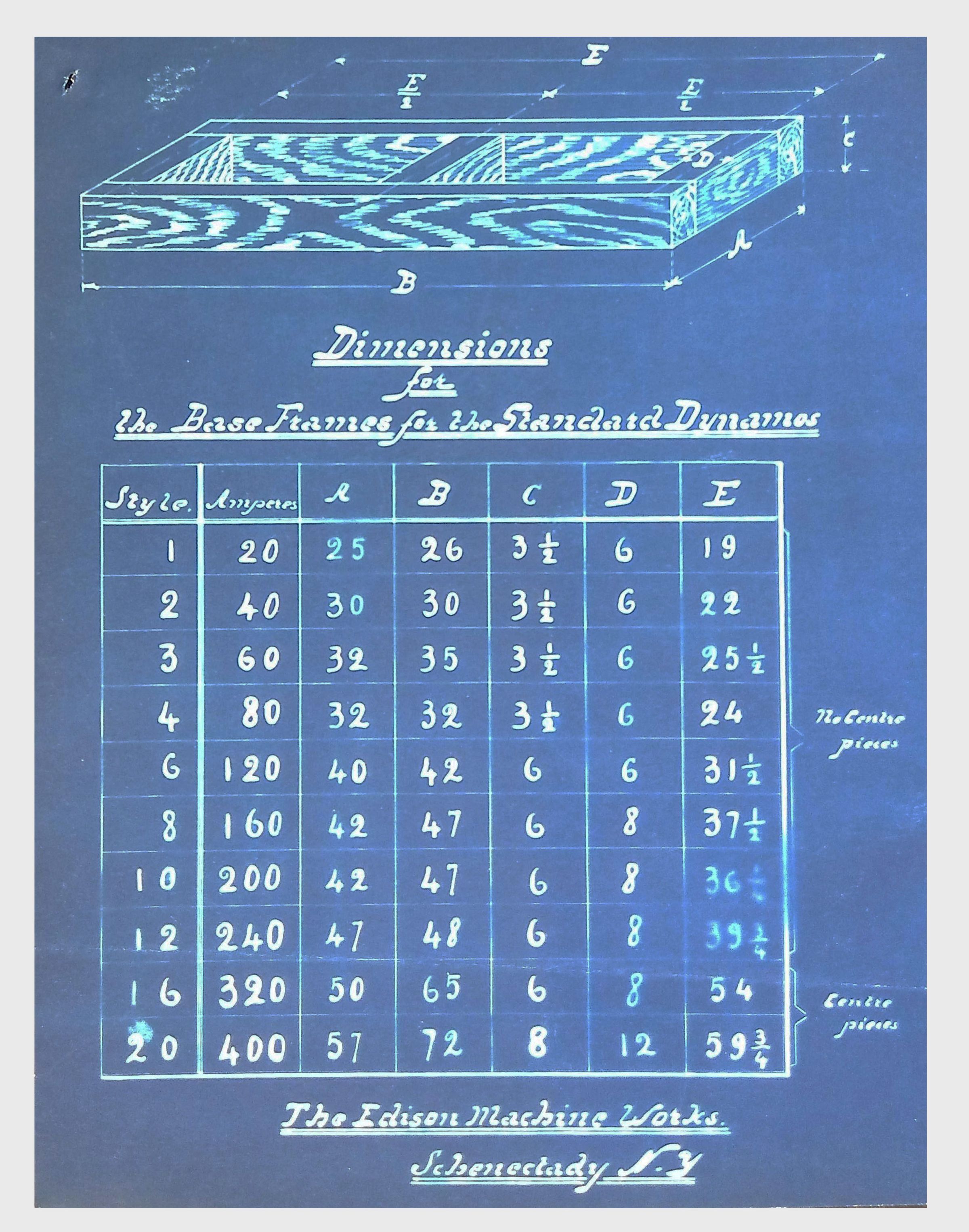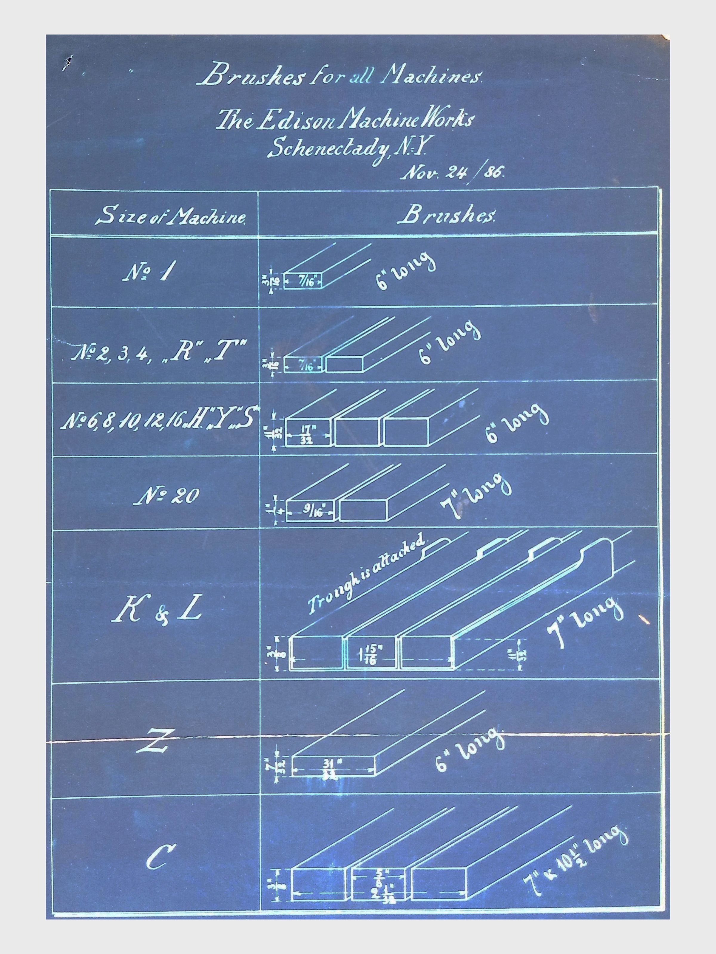 Two blank or labeled pages—likely index sheets or accompanying records. Blueprint of numerical calculations related to machine dimensions, potentially linked to electrical systems or industrial engineering. Detailed technical schematic outlining specifications for machine components, labeled with part names and measurements. Fragmented blueprint document, possibly showing wear or damage, indicating historical significance and extensive use. These blueprints—one of which is dated November 24, 1886— were kept by Lewis Latimer, and may reflect work he performed at or for the Edison Machine Works at Schenectady, New York, during his employment under Edison.