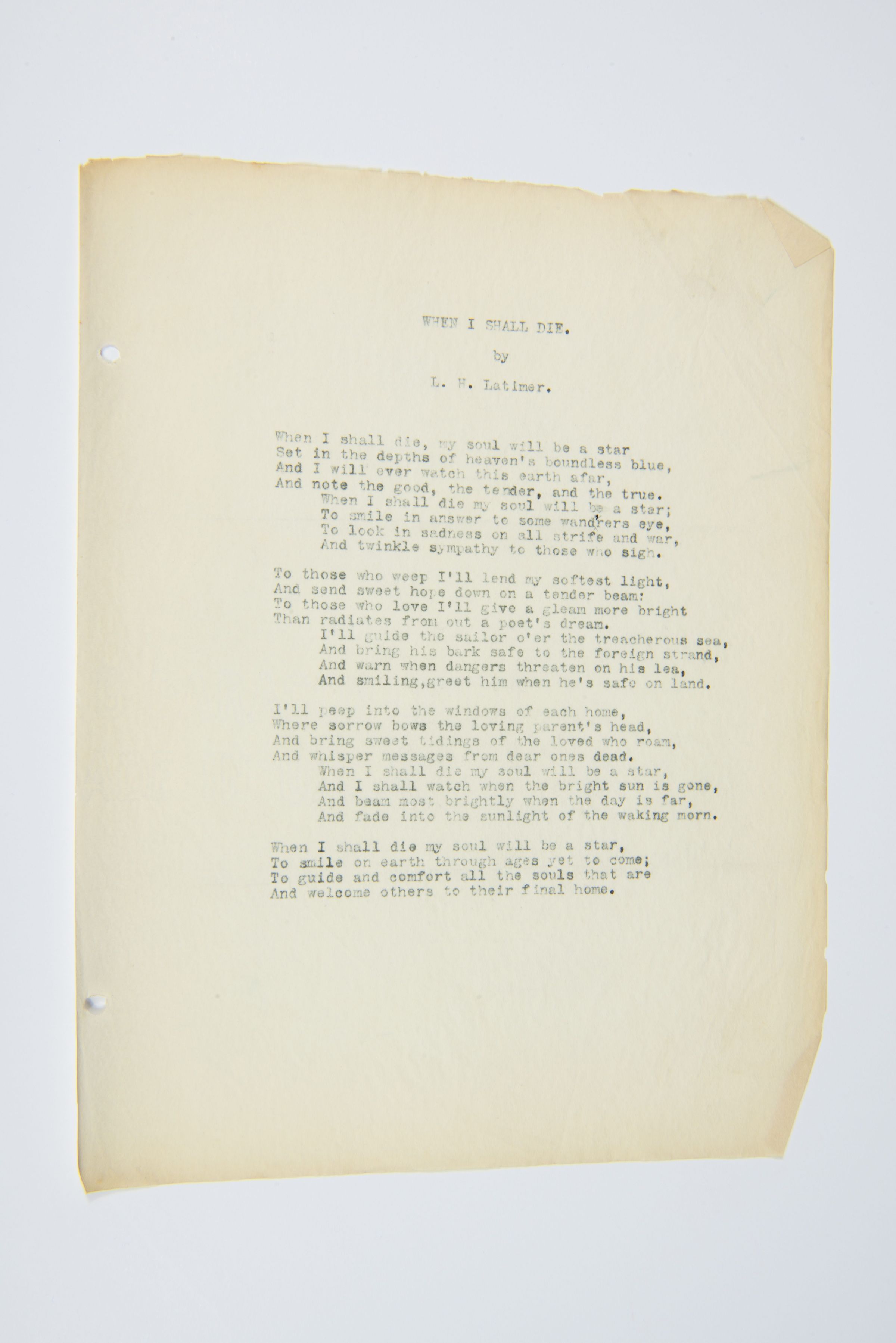 Lewis H. Latimer was not only a prominent inventor and engineer, known for his contributions to electric lighting and telecommunication, but also a poet and intellectual. This poem showcases his literary talents, providing insight into his personal beliefs and reflections on mortality. It reveals a deeply humanistic and hopeful outlook, emphasizing his desire to continue guiding and comforting others even after death. This poem was likely written for personal reflection or shared with family and friends, illustrating Latimer’s philosophical and artistic side beyond his scientific achievements.