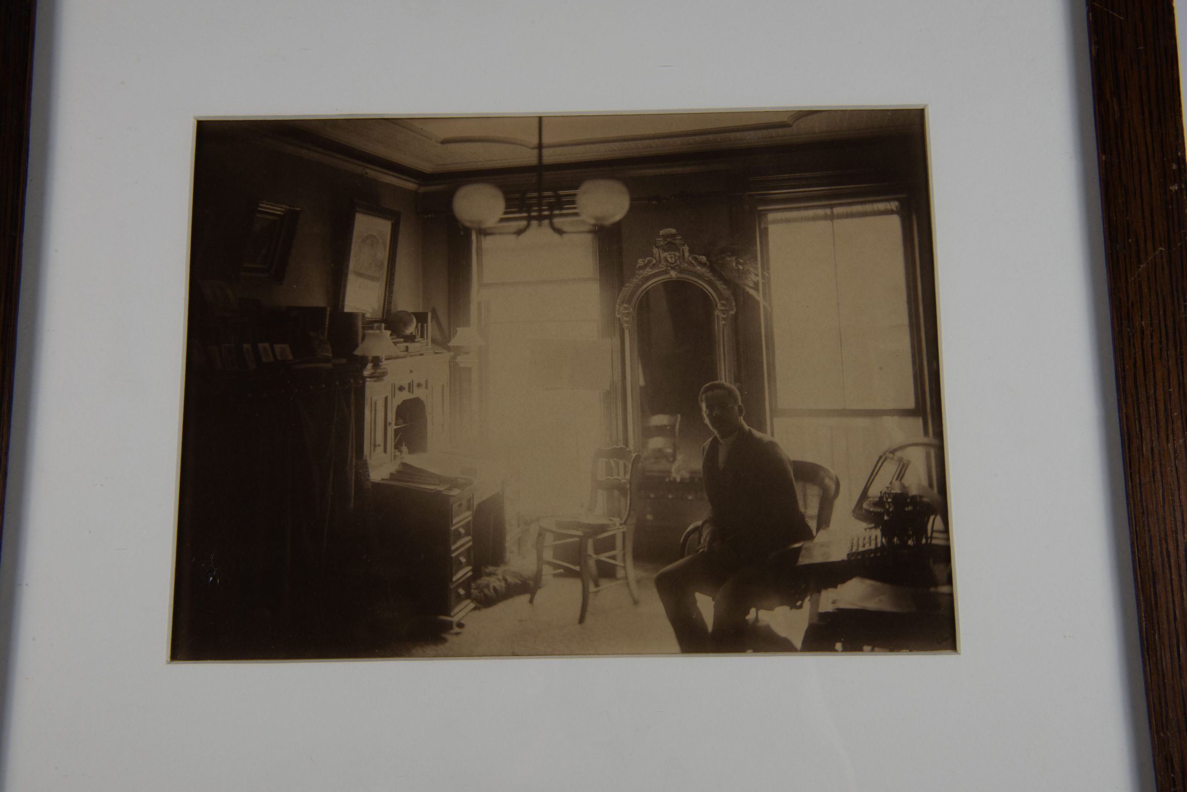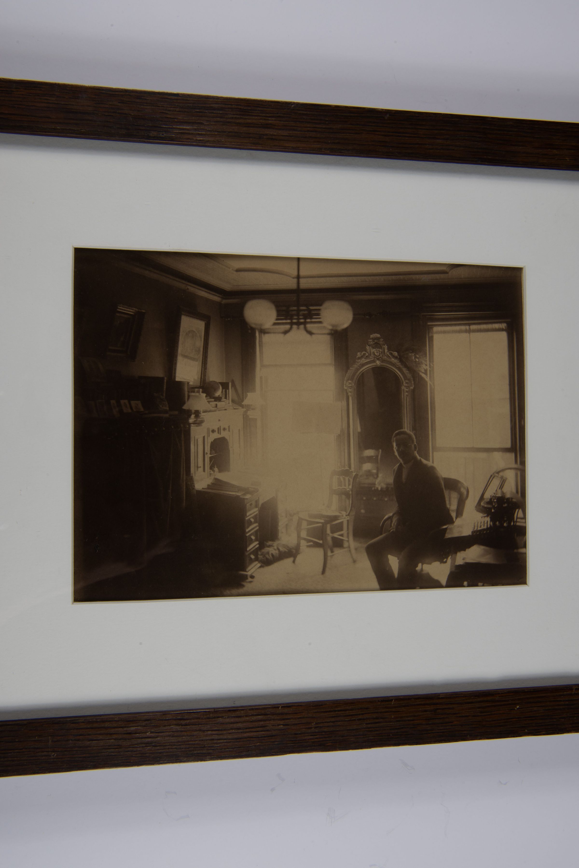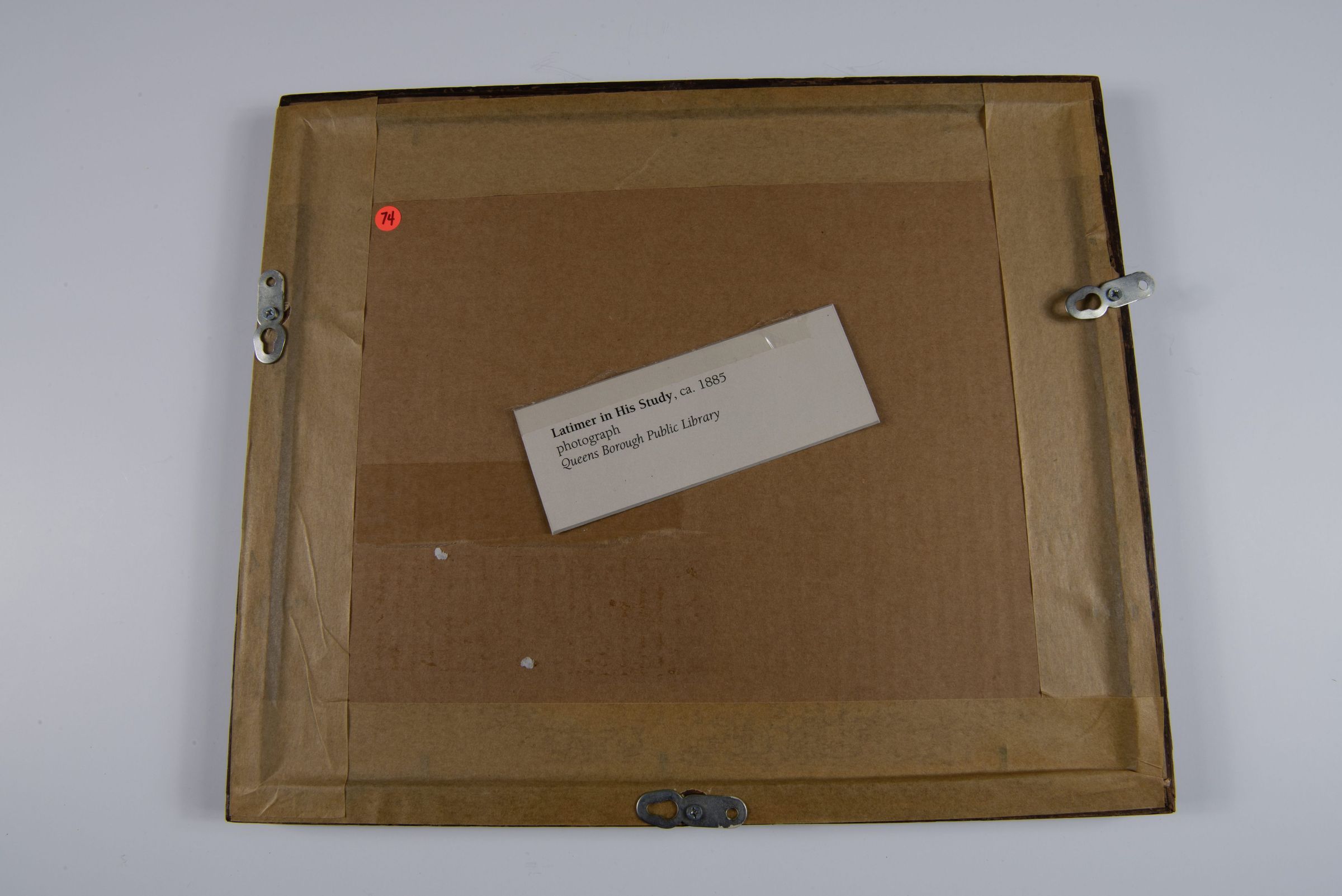The label on the back of the framed image reads: "Latimer in His Study, ca. 1885 Photograph Queens Borough Public Library"