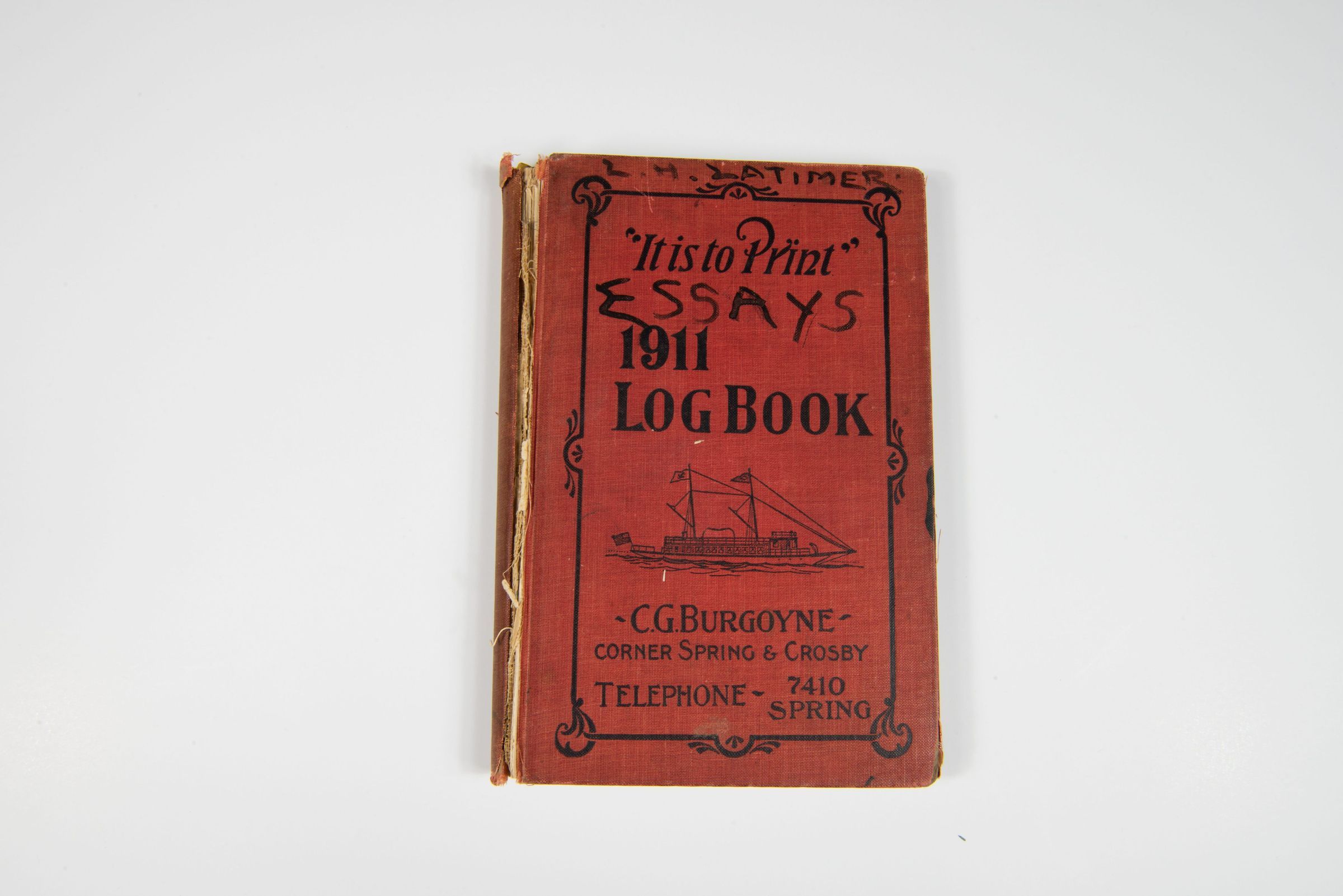 This is a 1911 log book used by Lewis H. Latimer for writing essays, including important autobiographical details on his early life and his relationship with Alexander Graham Bell.. The book's cover has the original printed title "1911 LOG BOOK", published by C.G. Burgoyne (a stationery and printing company at the corner of Spring & Crosby Streets, New York). The cover has been hand-modified with the handwritten text: "'It is to Print' ESSAYS" L. H. LATIMER is inscribed at the top. There is a decorative black border design around the cover, along with a detailed illustration of a sailing ship, which was likely part of the original printed design. The spine of the book appears worn and frayed, suggesting extensive use over time.