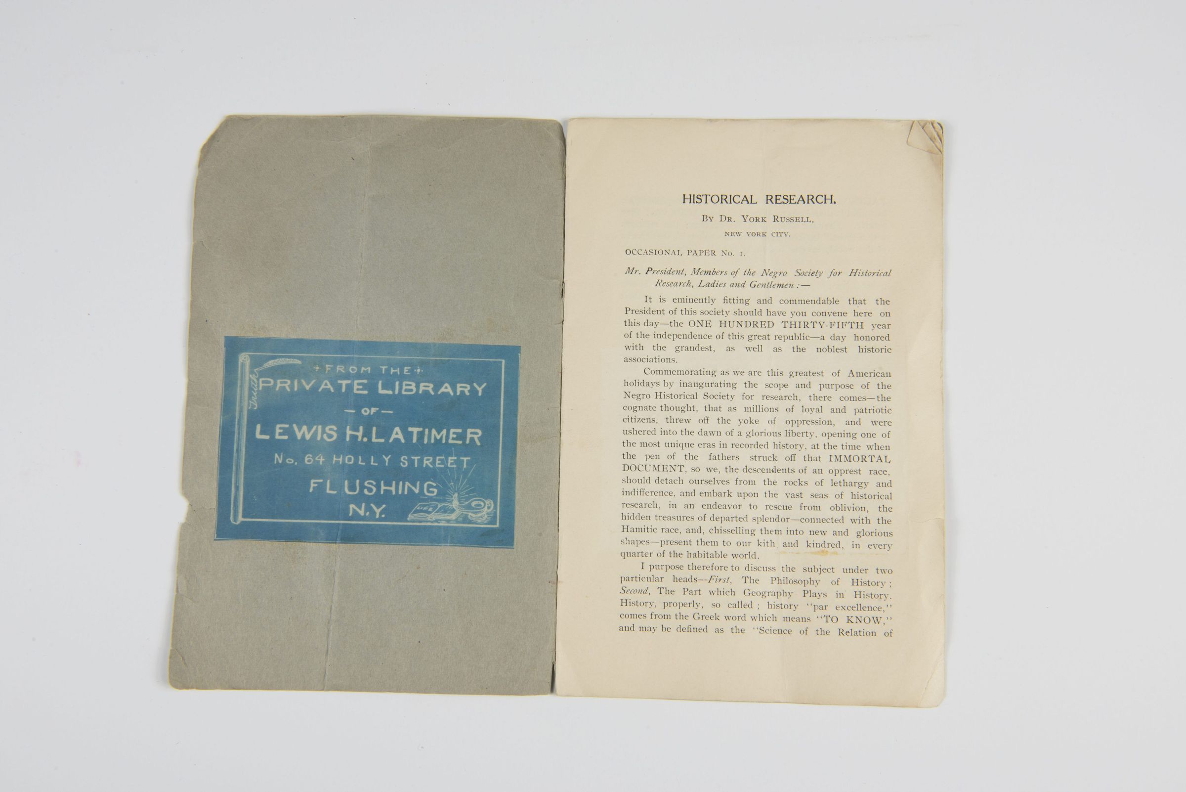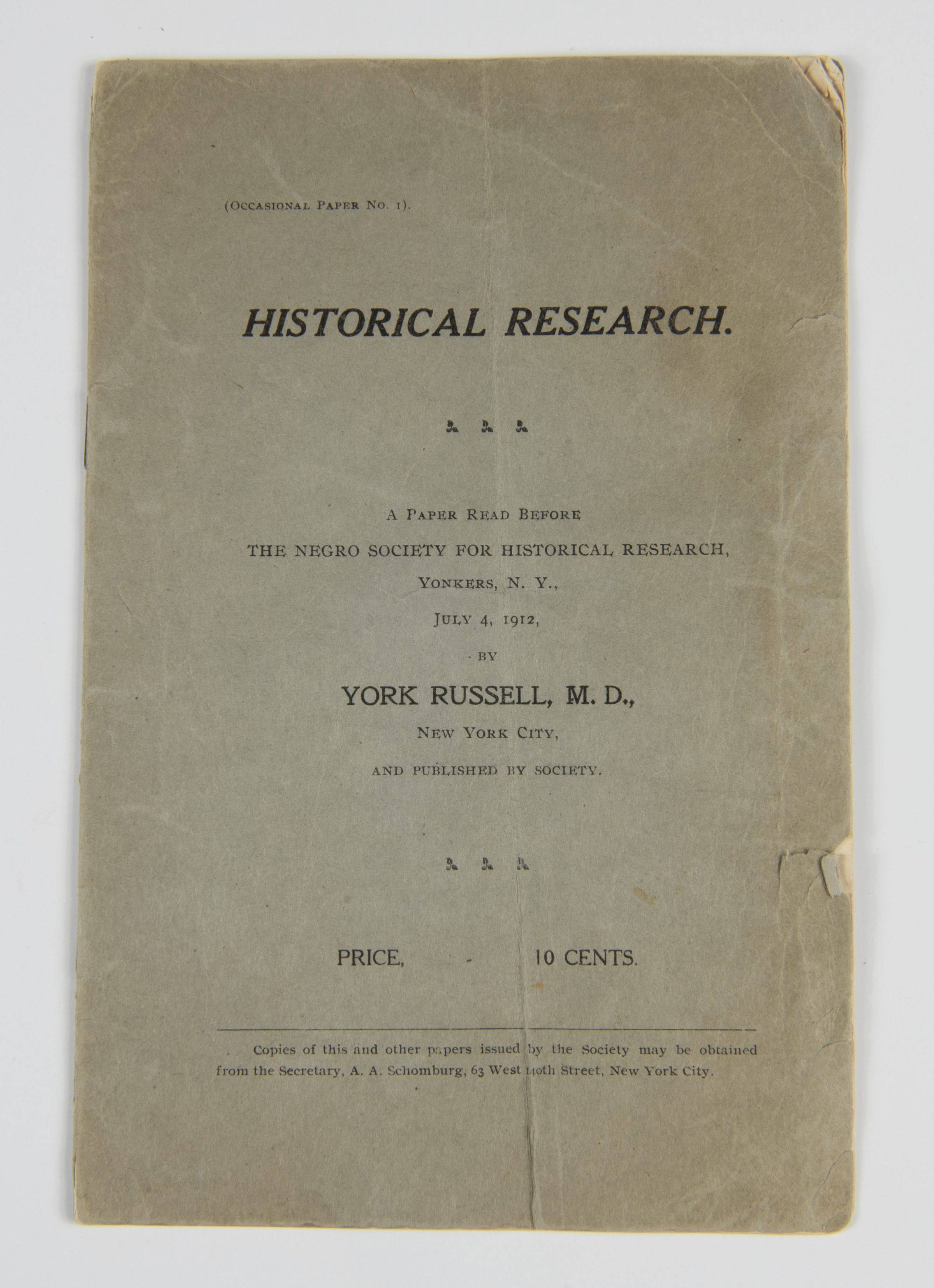 Keywords: Historical Research, Negro Society for Historical Research, African American history, York Russell, Lewis H. Latimer collection, 1912 pamphlet, African American archival documents
