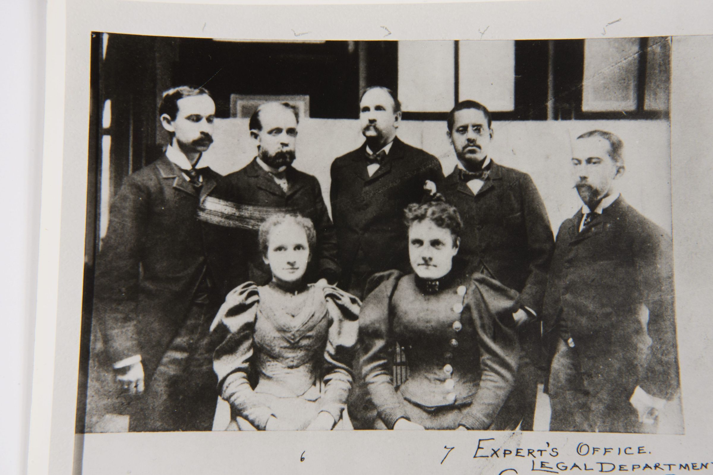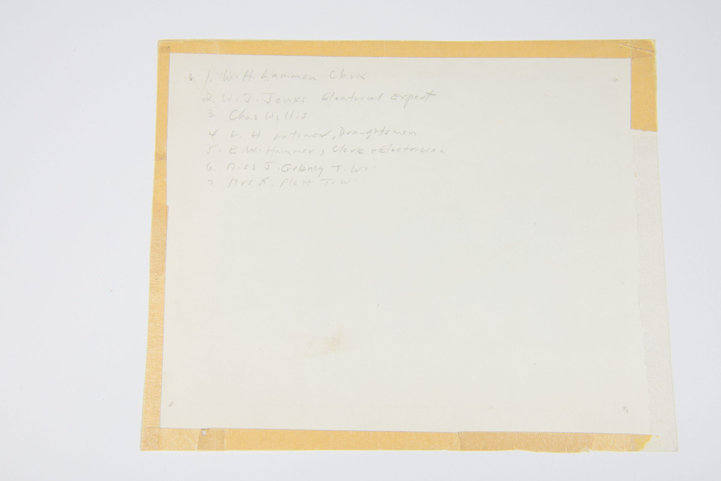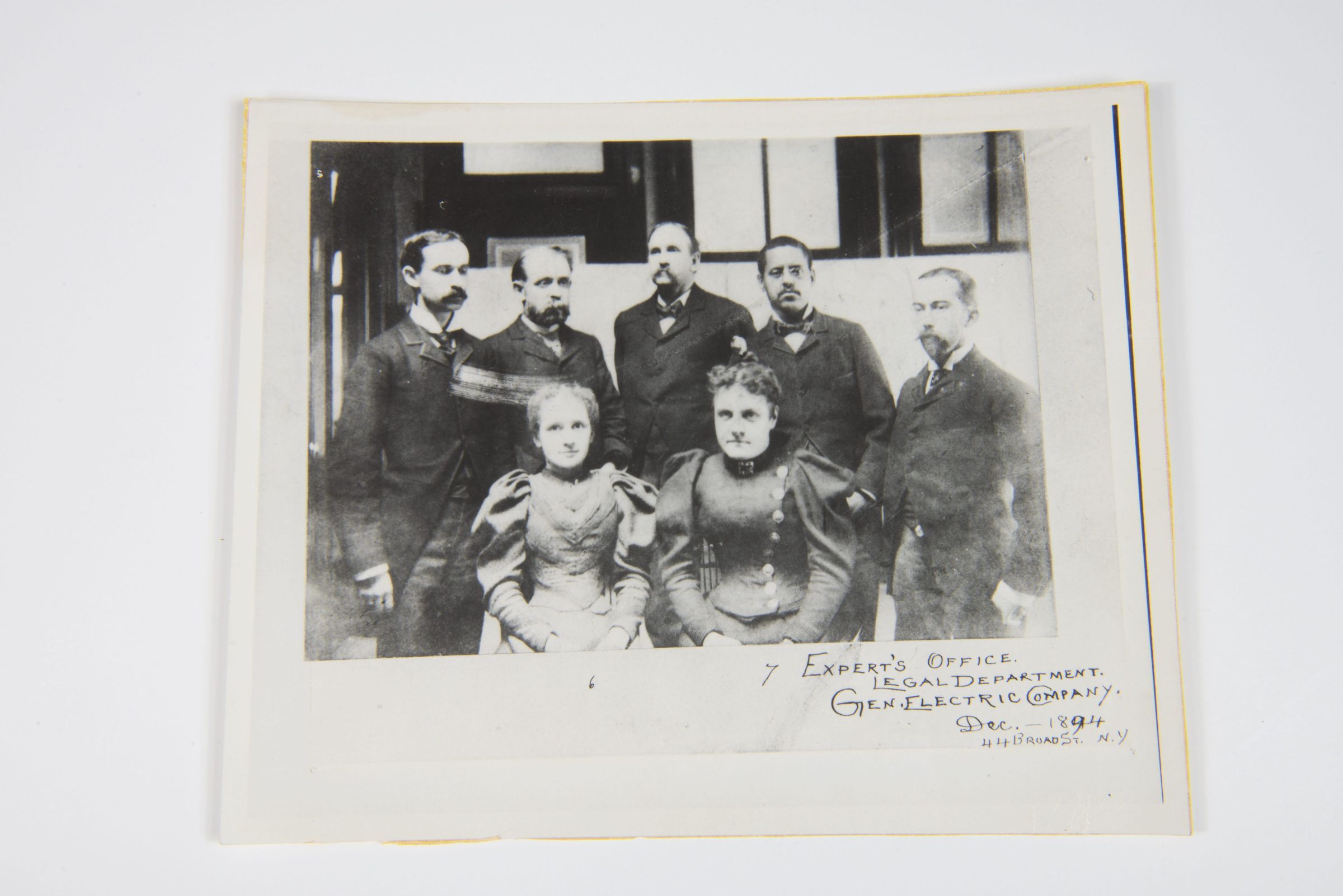 Front of the photograph: Caption: "Expert’s Office. Legal Department. Gen. Electric Company. Dec. 1894. Harrison, N.Y." Back of the photograph: W.H. Hamman Clerk W.J. Jones Electrical Expert Chas Wills L.H. Latimer, Draughtsman E.W. Hammans Clerk & Electrician Miss J. Gibney T.W. Mrs. R. Platt T.W.
