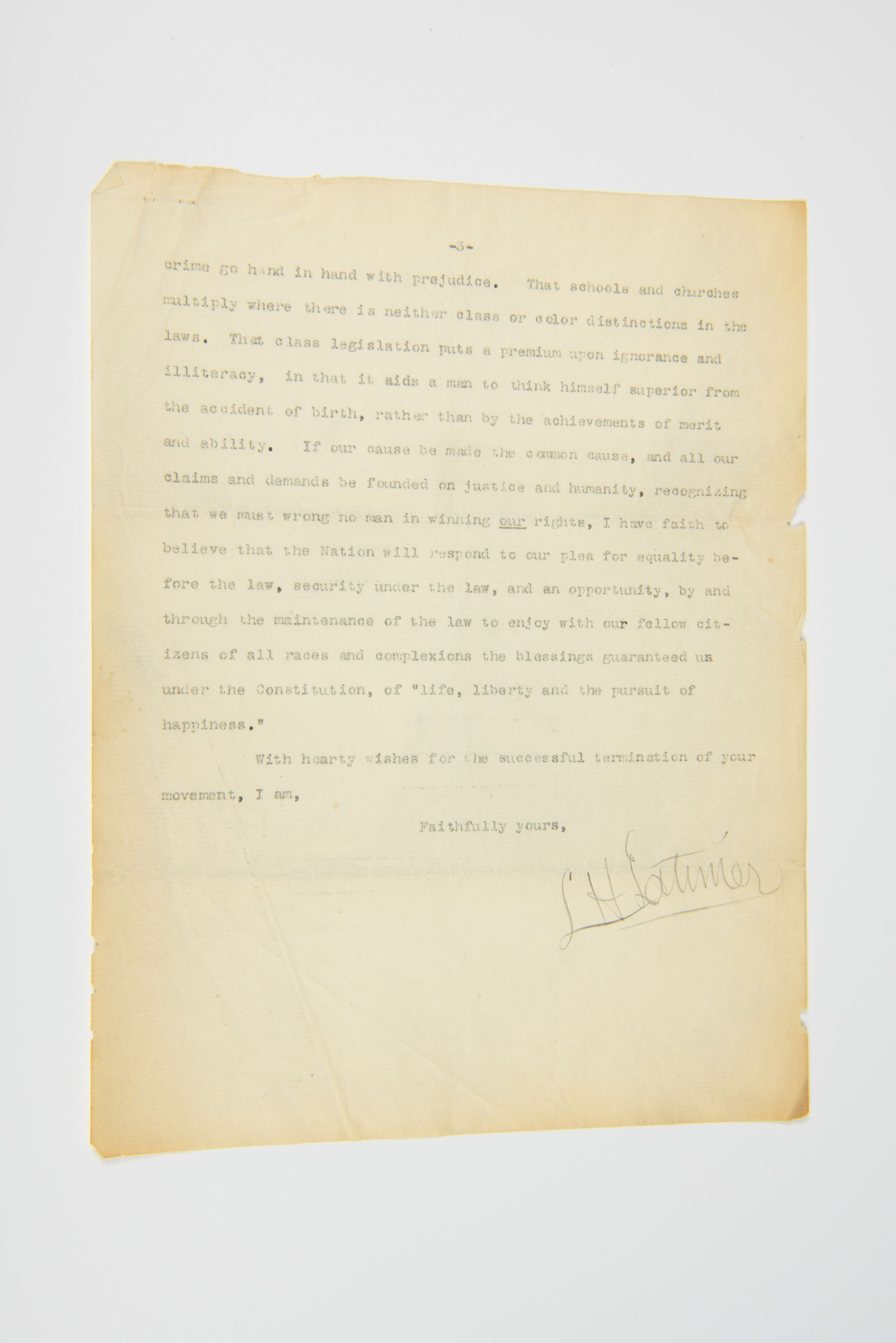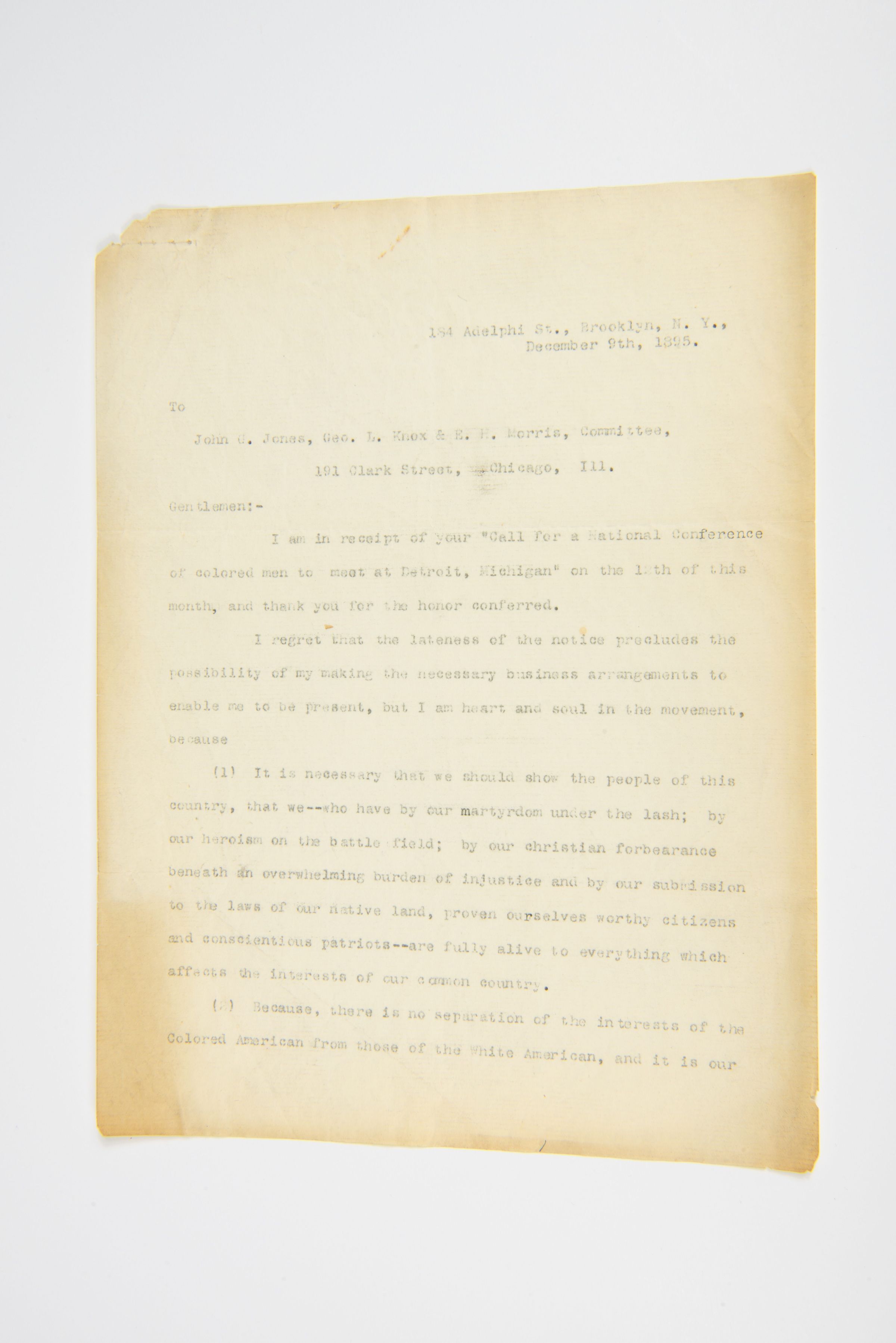 184 Adelphi St., Brooklyn, N.Y., December 9th, 1895. To John C. Jones, Geo. L. Knox & E. H. Morris, Committee, 191 Clark Street, - Chicago, Ill. Gentlemen: - I am in receipt of your "Call For a National Conference of colored men to meet at Detroit, Michigan" on the 12th of this month, and thank you for the honor conferred. I regret that the lateness of the notice precludes the possibility of my making the necessary business arrangements to enable me to be present, but I am heart and soul in the movement, because (1) It is necessary that we should show the people of this country, that we -- who have by our martyrdom under the lash; by our heroism on the battle field; by our christian forbearance beneath an overwhelming burden of injustice and by our submission to the laws of our native land, proven ourselves worthy citizens and conscientious patriots -- are fully alive to everything which affects the interests of our common country. (2) Because, there is no separation of the interests of the Colored American from those of the White American, and it is our duty to show to our country, and to the world, that we are looking to the interest of the people at large, when we protest against the crime and injustice meted out to any class or condition of our citizens. (3) Because the community which permits a crime against its humblest member to go unpunished, is nursing into life and strength a power which will ultimately threaten its own existence. (4) Because our history conclusively proves that the attempt to degrade any portion, class or race of our common people, has always been fraught with more danger to the oppressor than to the oppressed. (5) Because an even-handed justice to all, under and through the law, is the only safe course to pursue; for where might makes right, brute strength will supersede intelligence in the control of our communities, and the asses heels beat out the statesman’s brains. These are a few of the reasons why we should have a National Convention, and if that convention, forgetting all other considerations, directs its energies to presenting its cause before the people, as it affects the people at large; presenting it as our fathers did the question of slavery, with facts and figures, showing, as it can be shown, that where the Colored American is lynched the White American is assassinated. That ignorance and crime go hand in hand with prejudice. That schools and churches multiply where there is neither class or color distinctions in the laws. That class legislation puts a premium upon ignorance and illiteracy, in that it aids a man to think himself superior from the accident of birth, rather than by the achievements of merit and ability. If our cause be made the common cause, and all our claims and demands be founded on justice and humanity, recognizing that we must wrong no man in winning our rights, I have faith to believe that the Nation will respond to our plea for equality before the law, security under the law, and opportunity, by and through the maintenance of the law to enjoy with our fellow citizens of all races and complexions the blessings guaranteed us under the Constitution, of "life, liberty and the pursuit of happiness." With hearty wishes for the successful termination of your movement, I am, Faithfully yours, L. Latimer