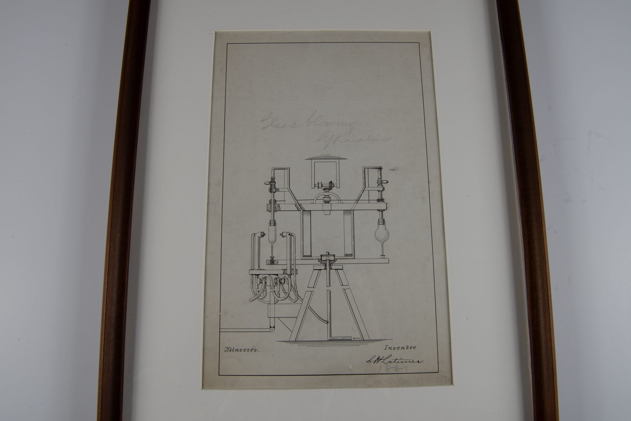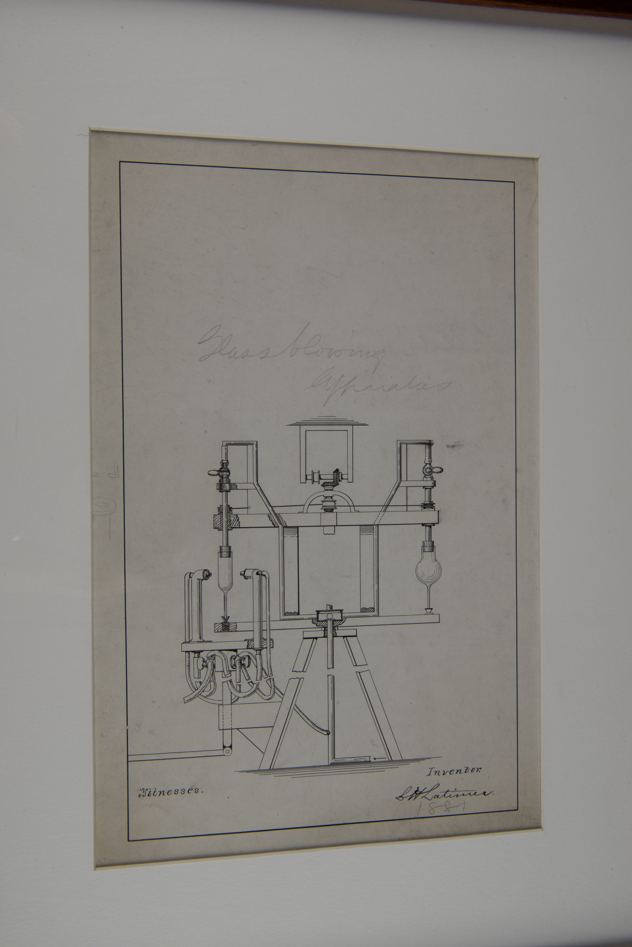Handwritten label: "Glass Blowing Apparatus" Signature: "L.H. Latimer 1881" Labeled "Witnesses" section, indicating that this might have been part of a patent application or engineering documentation. This document highlights Latimer’s engineering ingenuity beyond the carbon filament, demonstrating his multifaceted contributions to electric light bulb production.