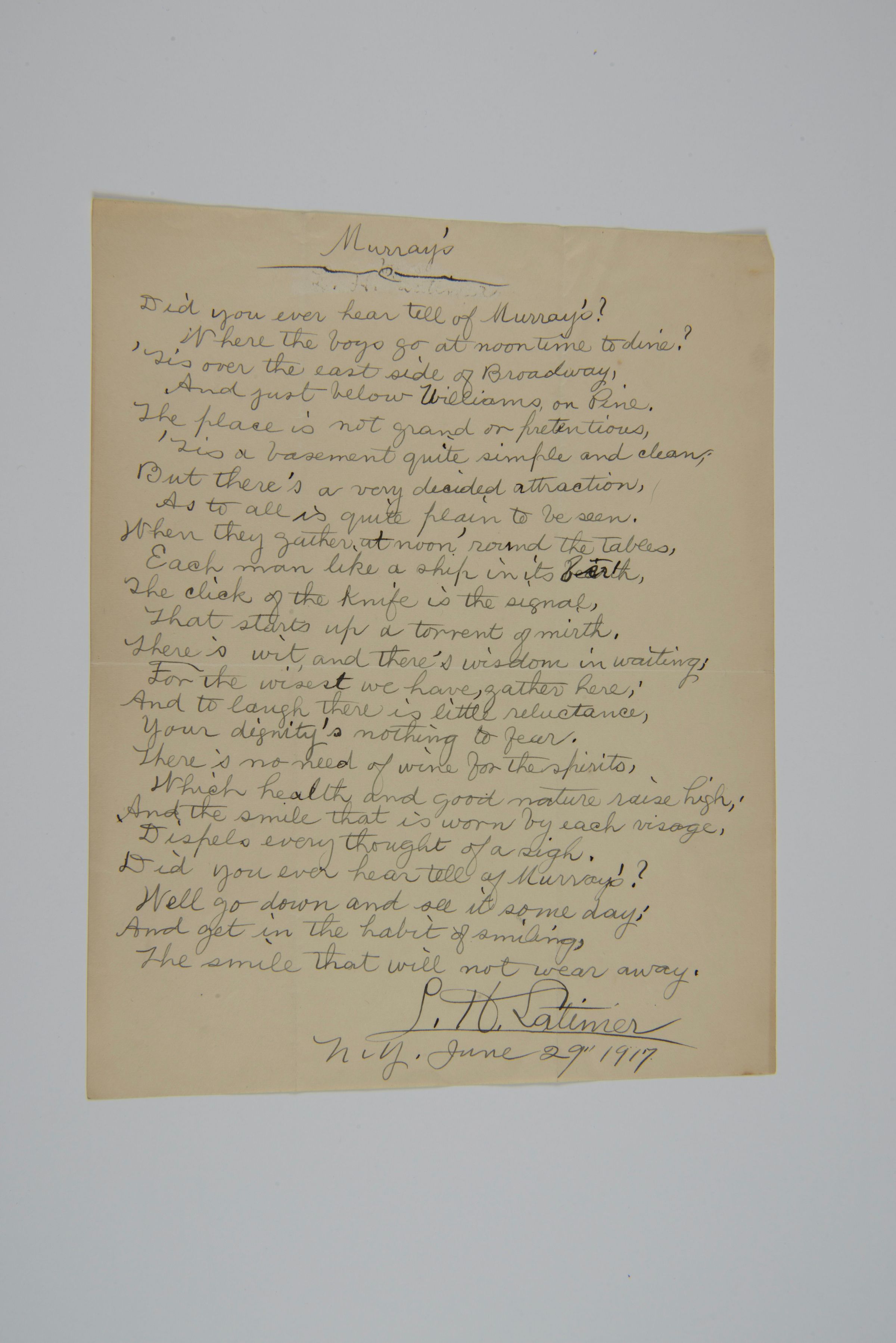 Murray’s "Did you ever hear tell of Murray’s? Where the boys go at noontime to dine? ‘Tis over the east side of Broadway, And just below Williams, on Pine. The place is not grand or pretentious, ‘Tis a basement quite simple and clean; But there’s a very decided attraction, As to all is quite plain to be seen. When they gather at noon round the tables, Each man like a ship in its berth, The click of the knife is the signal, That stirs up a torrent of mirth. There is wit and there’s wisdom in waiting, For the wisest we have gathered here; And to laugh there is little reluctance, Your dignity’s nothing to fear. There’s no need of wine for the spirits, Which health and good nature raise high, And the smile that is worn by each visage, Dispels every thought of a sigh. Did you ever hear tell of Murray’s!? Well go down and see us some day! And get in the habit of smiling, The smile that will not wear away. L. H. Latimer N.Y., June 29, 1917