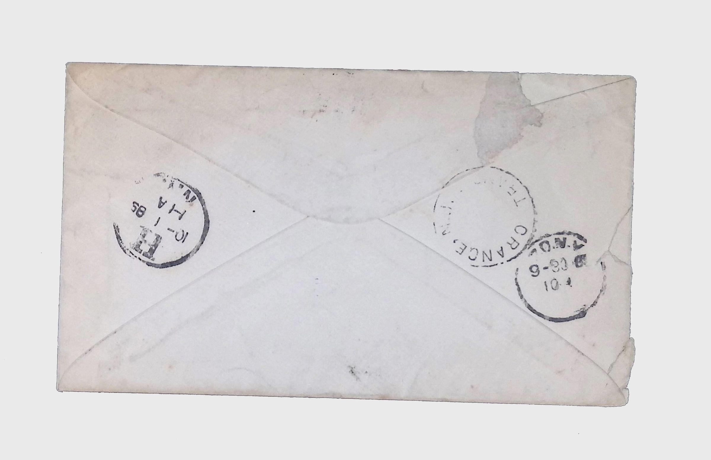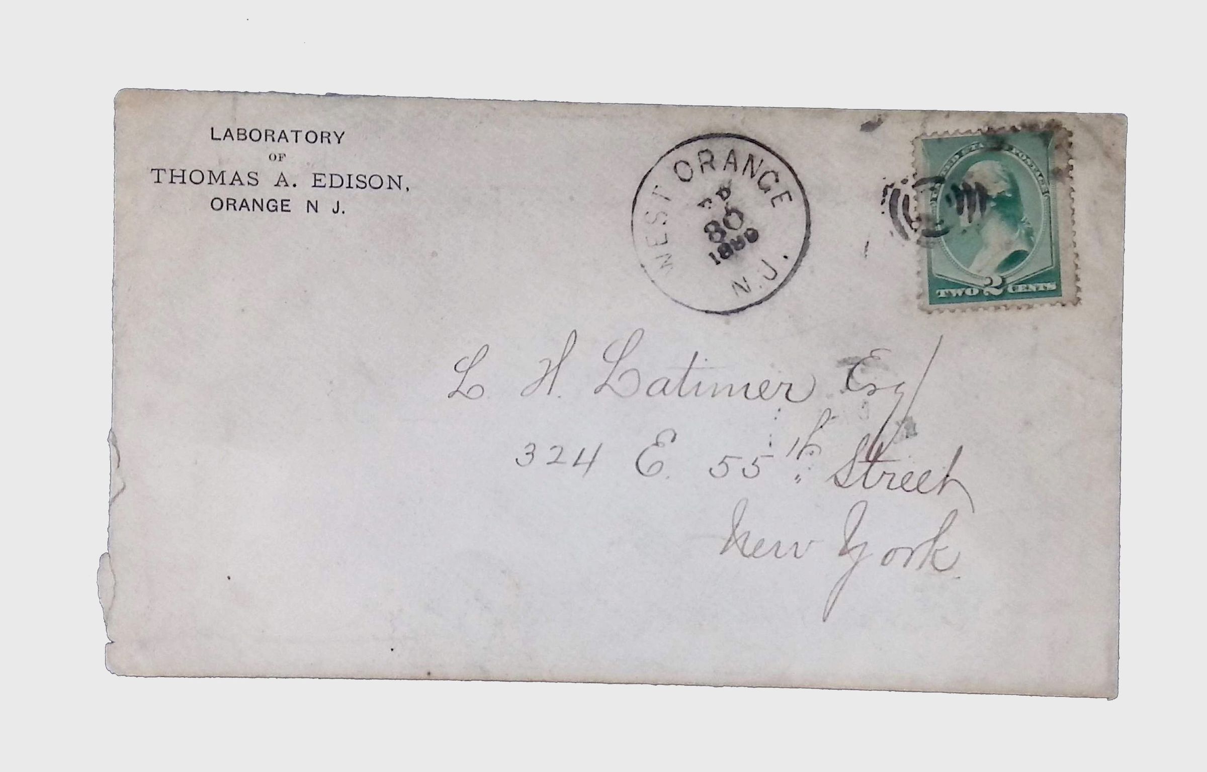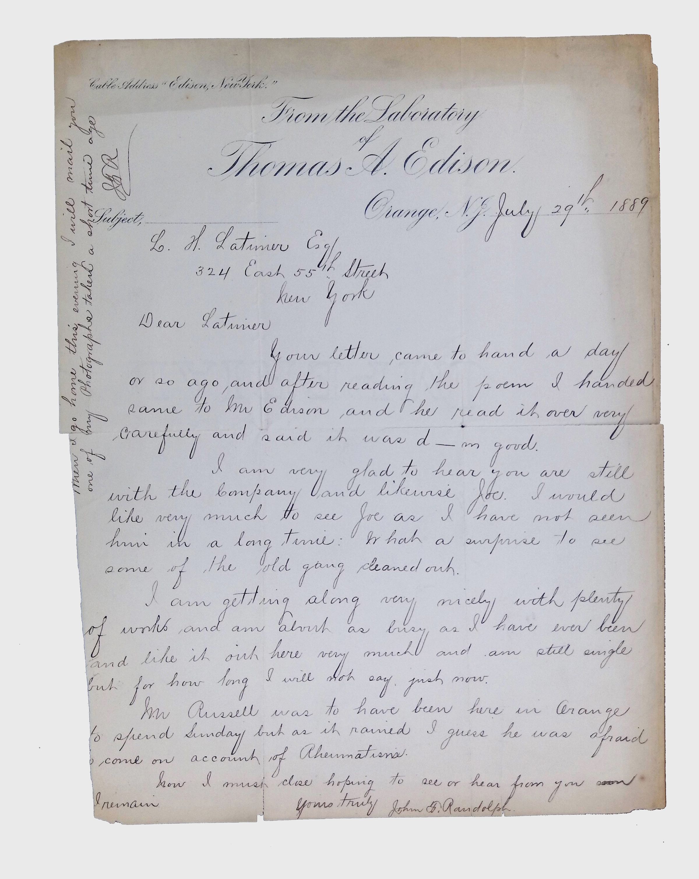 A letter from John F. Randolph, Lewis Latimer’s friend and former colleague, written from Thomas Edison’s laboratory at Orange [today West Orange], New Jersey, dated July 29th, 1889, with envelope. Randolph was working on site with Edison, while Latimer worked in one of Edison’s New York City offices. Writing in response to a letter and poem that Latimer had recently sent him, Randolph reports that “after reading the poem I handed same to Mr. Edison and he read it over very carefully and said it was d—m [i.e., damn] good.”